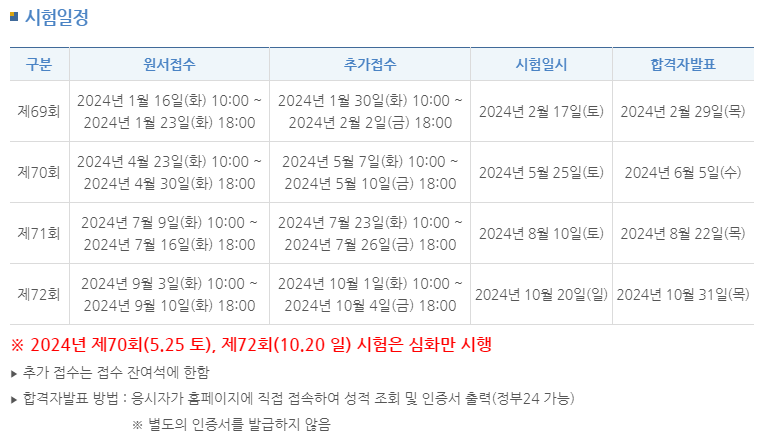 성적통지 방법 : 응시자가 인터넷 성적 조회, 인증서 출력(홈페이지, 정부 24)