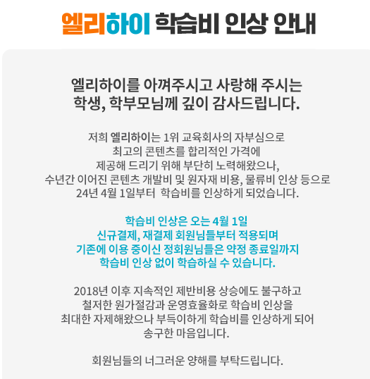 엘리하이 학습비 인상이 오는 4월 1일 신규결제, 재결제 회원님들부터 적용된다고 해요.