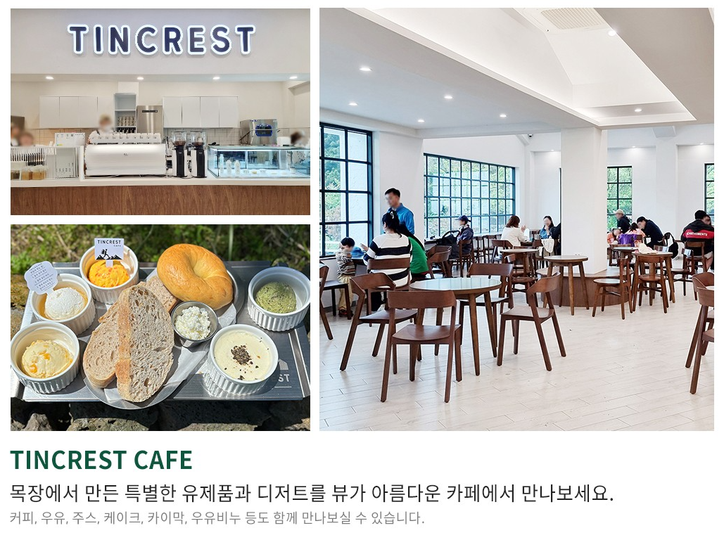 ◈ TINCREST CAFE목장에서 만든 특별한 유제품과 디저트를 뷰가 아름다운 카페에서 만나보세요.커피, 우유, 주스, 케이크, 카이막, 우유비누 등도 함께 만나보실 수 있습니다.