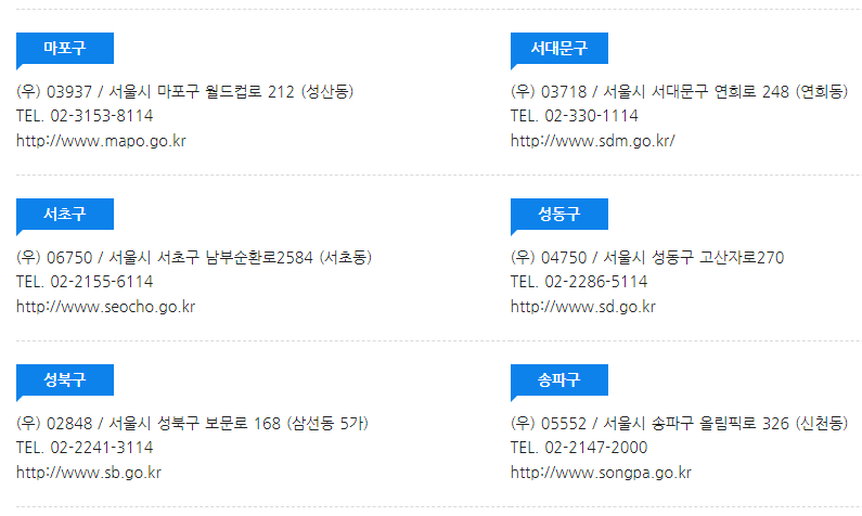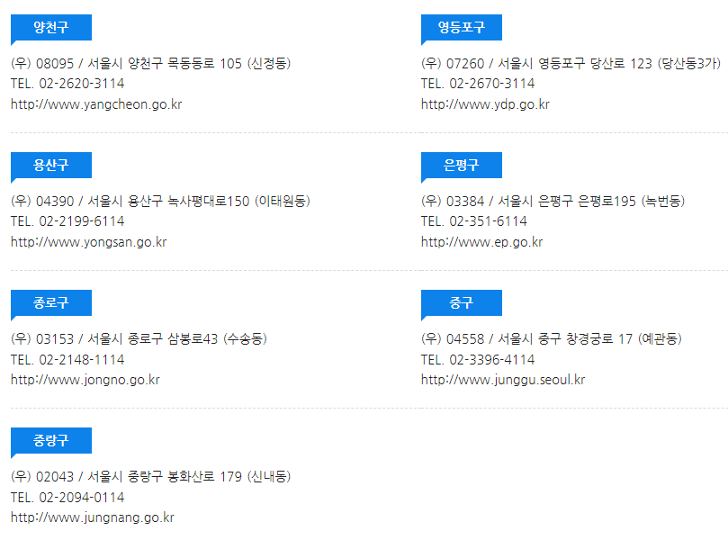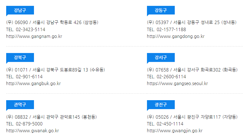 강남구, 강동구, 강북구, 강서구, 관악구, 광진구, 구로구, 금천구, 노원구, 도봉구, 동대문구, 동작구, 마포구, 서대문구, 서초구, 성동구, 성북구, 송파구, 양천구, 영등포구, 용산구, 은평구, 종로구, 중구, 중랑구