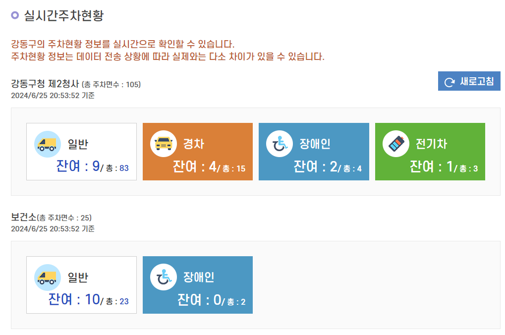 강동구의 주차현황 정보를 실시간으로 확인할 수 있습니다.