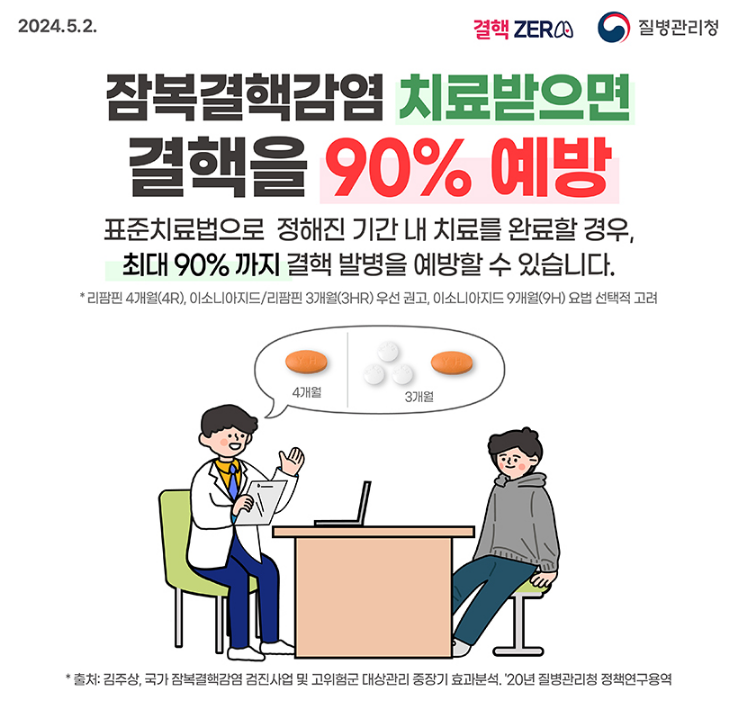 표준치료법으로 정해진 기간 내 치료를 완료할 경우, 최대 90% 까지 결핵 발병을 예방할 수 있습니다.