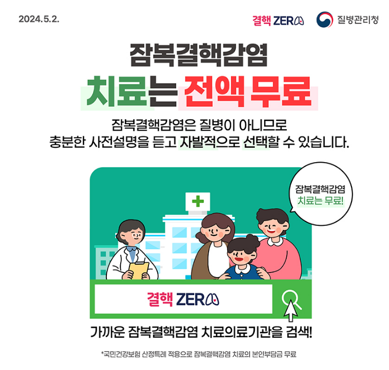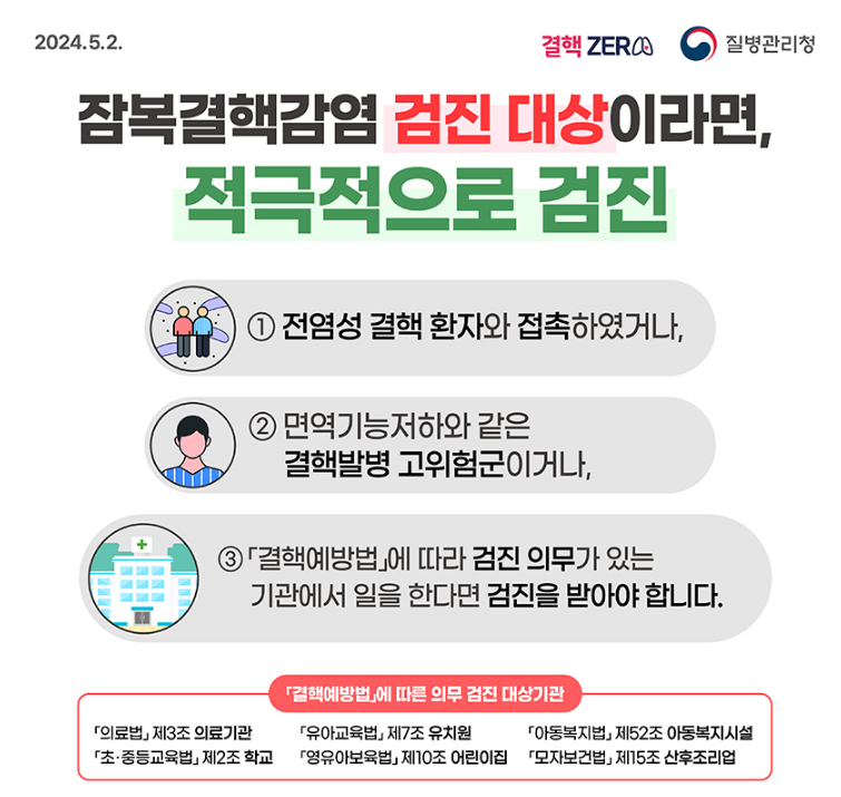 질병관리청은 의무검진 대상 기관의 검진과 치료방향을 제시하는 잠복결핵감염 관리 안내를 2024년 4월 발간했습니다.