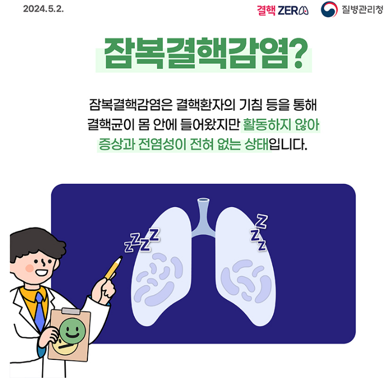잠복결핵감염은 결핵환자의 기침 등을 통해 결핵균이 몸 안에 들어왔지만 활동하지 않아 증상과 전염성이 전혀 없는 상태입니다.