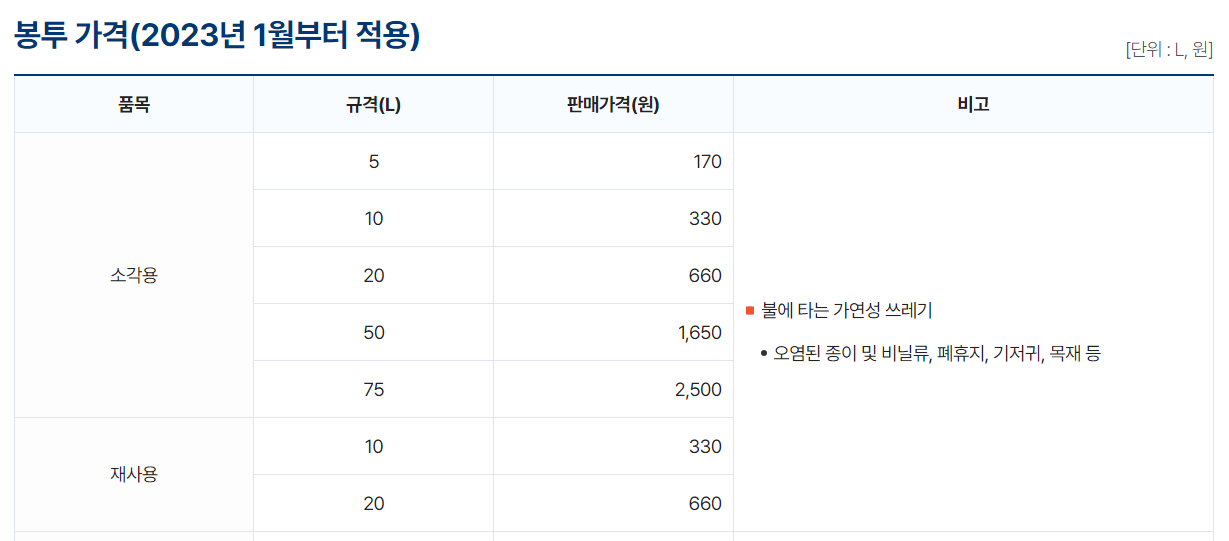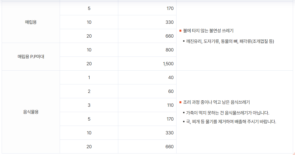 | 구리시 종량제봉투 가격 크기 음식물쓰레기 봉투 대형폐기물 수수료 폐가전제품 무상수거 무료수거 인터넷 신고 판매처 (1) | 2024.07.16 |