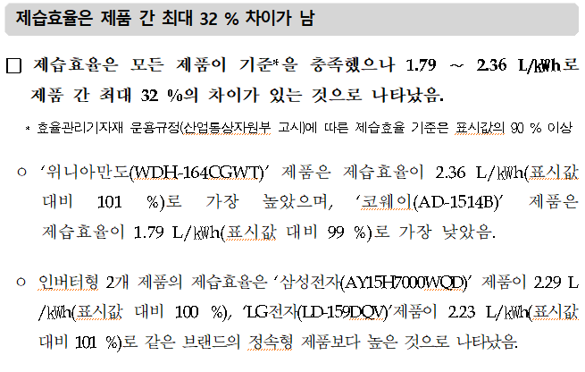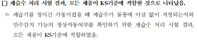 ⊙ 제습수 처리 시험 결과, 모든 제품이 KS기준에 적합한 것으로 나타났음.