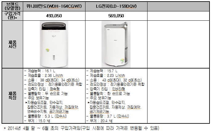 제습기를 구입하고자 하는 소비자 1000명을 대상으로 설문조사를 실시한 결과, 소비자 선호도가 높았던 상위 10개 브랜드 중 2014년에 출시된 9개 업체 11개 제품을 시험 대상으로 선정하였다고 합니다.