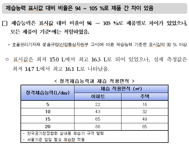 ◈ 제습능력 표시값 대비 비율은 94~105%로 제품 간 차이 있음