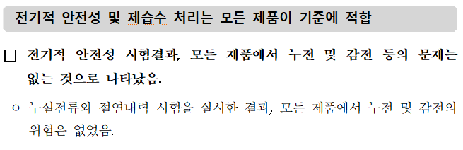 ⊙ 전기적 안전성 시험결과, 모든 제품에서 누전 및 감전 등의 문제는 없는 것으로 나타났음.