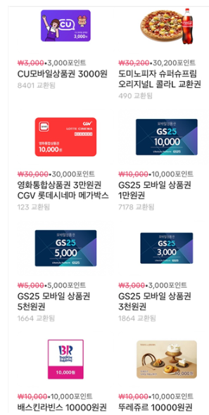 CU모바일 상품권, 도미노피자 교환권, CGV, 롯데시네마, 메가박스 상품권, GS25 모바일 상품권, 베스킨라빈스, 뚜레쥬르, 신세계 상품권, 배민 상품권 등 있어요.