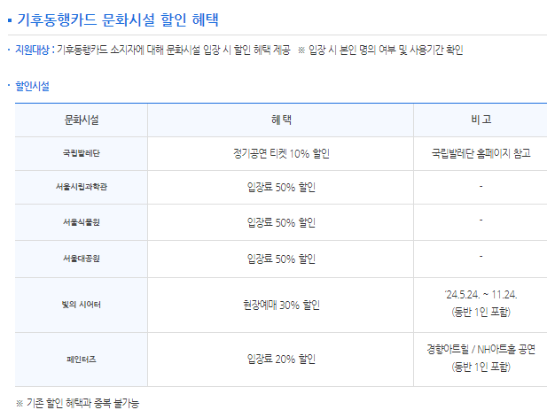 ◈ 할인시설국립발레단 - 정기공연 티켓 10% 할인(국립발레단 홈페이지 참고)서울시립과학관 - 입장료 50% 할인서울식물원 - 입장료 50% 할인서울대공원 - 입장료 50% 할인빛의 시어터 - 현장예매 30% 할인 (24. 5.24~11.24. 동반 1인 포함)페인터즈 - 입장료 20% 할인 (경향아트힐/ NH아트홀 공연 동반 1인 포함)