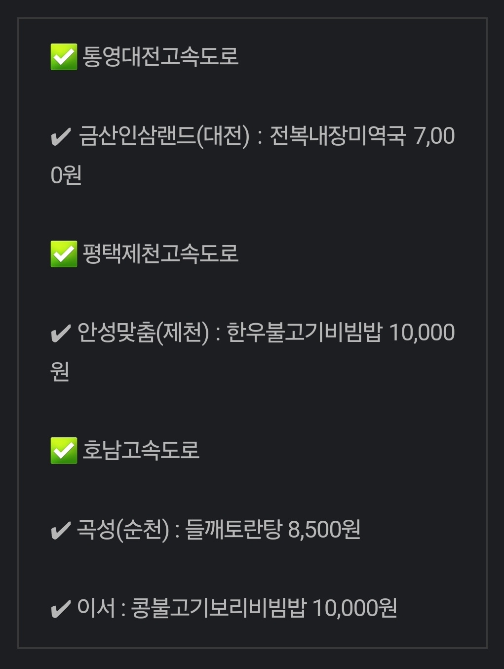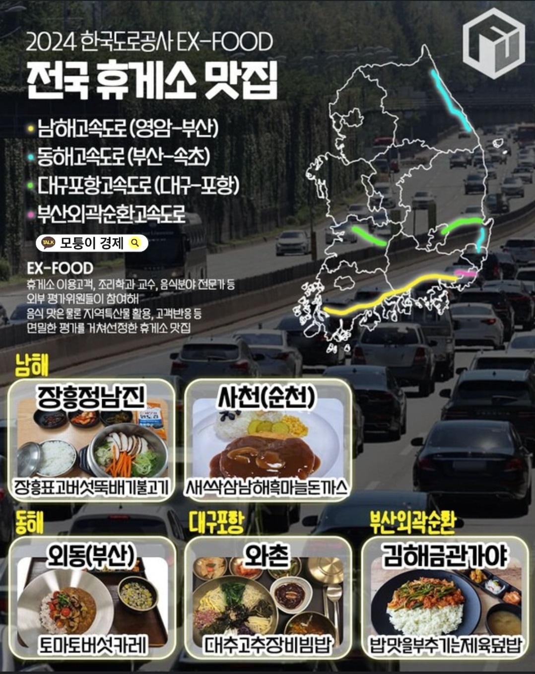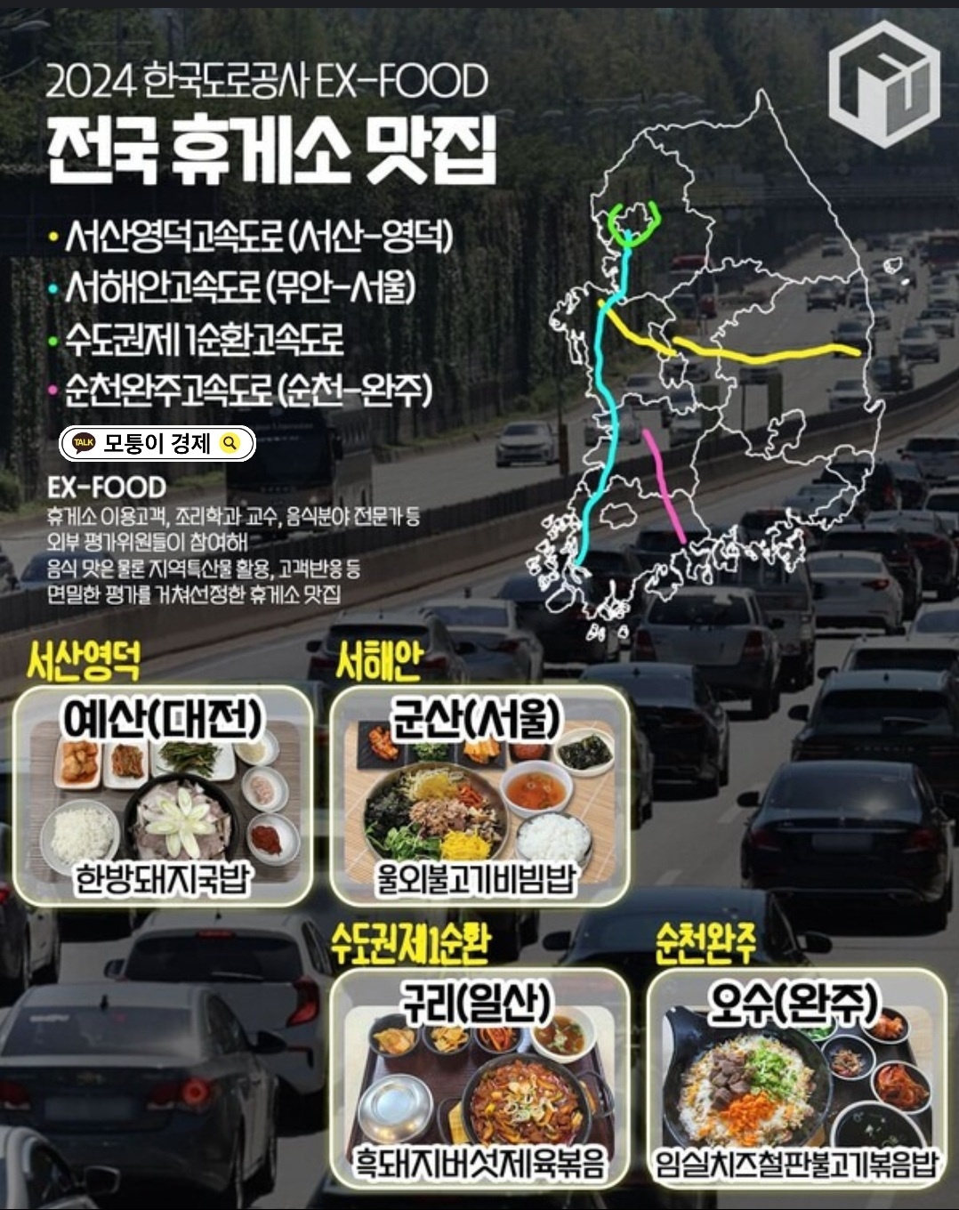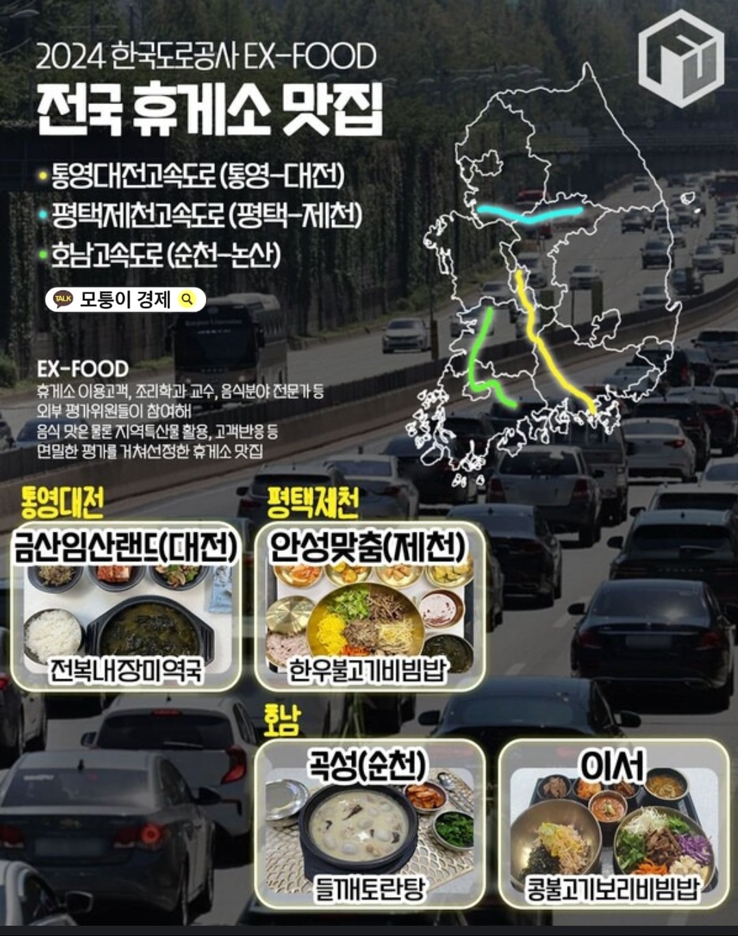 전국 고속도로 휴게소 맛집 지도 식사 음식 영동 경부 중부내륙 중앙 남해 동해 대구 포항 부산외곽순환 서산 영덕 서해안 순천 완전 수도권 제1순환 통영 대전 평택 제천 호남