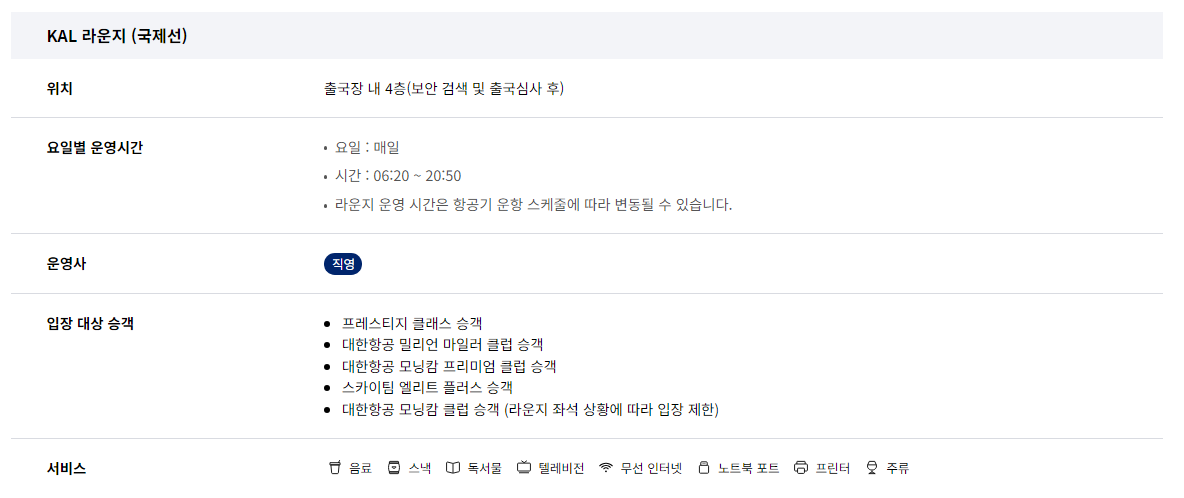 ⊙ 입장 대상 승객 : 프레스티지 클래스 승객, 대한항공 밀리언 마일러 클럽 승객, 대한항공 모닝캄 프리미엄 클럽 승객, 스카이팀 엘리트 플러스 승객(당일 이용하시는 스카이팀 항공사 국제선 항공권 또는 탑승권을 제시해 주시기 바랍니다), 대항항공 모닝캄 클럽 승객(라운지 좌석 상황에 따라 입장 제한)