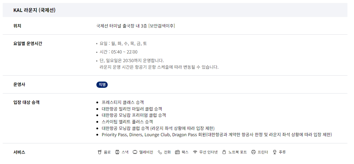 ⊙ 입장 대상 승객 : 프레스티지 클래스 승객, 대한항공 밀리언 마일러 클럽 승객, 대한항공 모닝캄 프리미엄 클럽 승객, 스카이팀 엘리트 플러스 승객, 대한항공 모닝캄 클럽 승객(라운지 좌석 상황에 따라 입장 제한), Priority Pass, Diners, Lounge Club, Dragon Pass 회원(대한항공과 계약한 항공사 한정 및 라운지 좌석 상황에 따라 입장 제한)