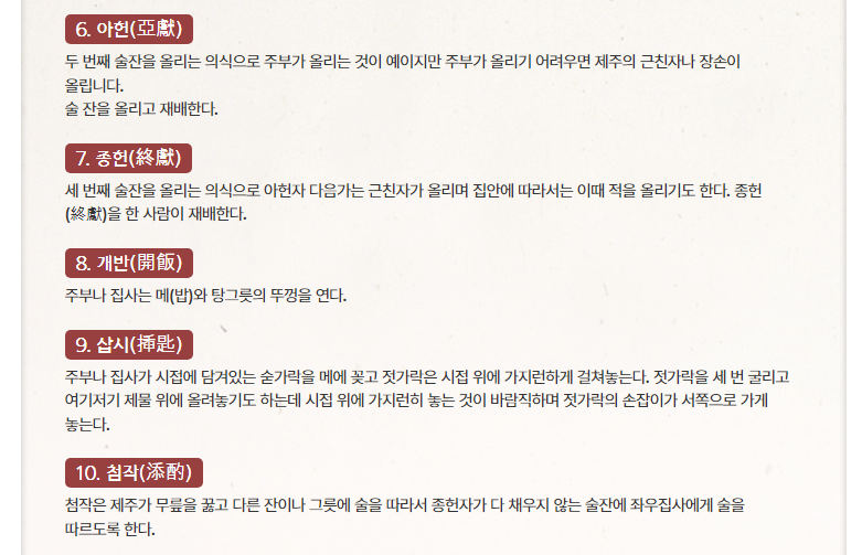 두 번째 술잔을 올리는 의식으로 주부가 올리는 것이 예이지만 주부가 올리기 어려우면 제주의 근친자나 장손이 올립니다. 술 잔을 올리고 재배한다.