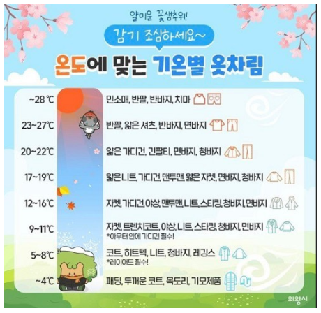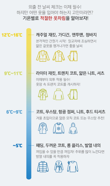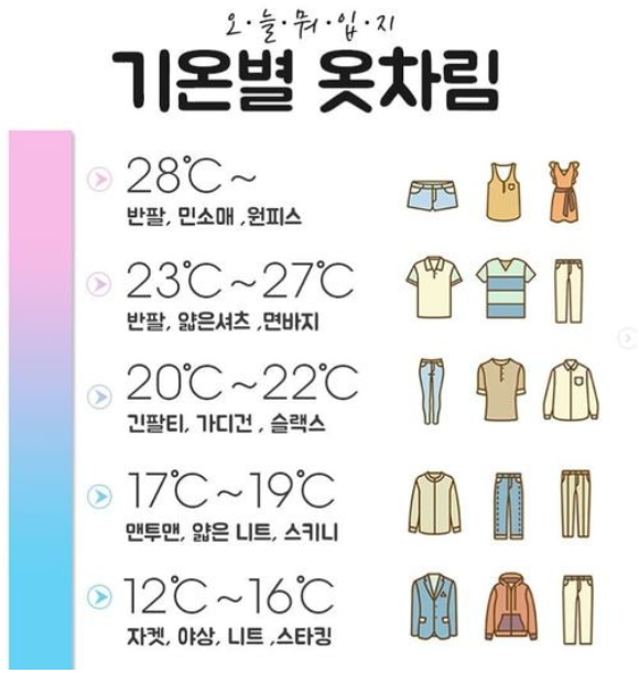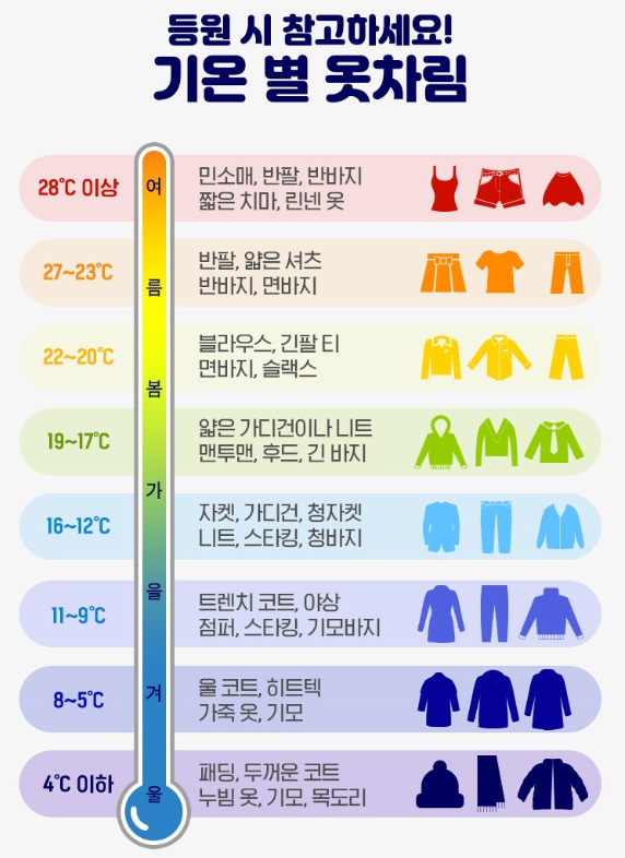 기온별 옷차림 온도별 옷차림 봄 여름 가을 겨울 체감온도 날씨 최저 최고 계절별