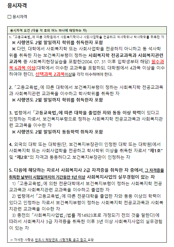 ※ 다만, 대학에서 사회복지학 또는 사회사업학을 전공하지 아니하고 동 석사학위를 취득한자는 보건복지부령이 정하는 사회복지학 전공교과목과 사회복지 관련 교과목 중 사회복지현장실습을 포함한(2004. 07. 31. 이후 입학생부터 해당) 필수과목 6과목 이상(대학에서 이수한 교과목을 포함하되, 대학원에서 4과목 이상을 이수하여야 한다), 선택과목 2과목 이상을 각각 이수하여야 한다.