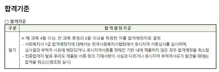 -사회복지사 1급 합격예정자에 대해서는 한국사회복지사협회에서 응시자격 서류심사를 실시하며, 심사결과 부적격 사유에 해당되거나 응시자격 서류를 정해지니 기한 내에 제출하지 않은 경우 합격예정을 취소함