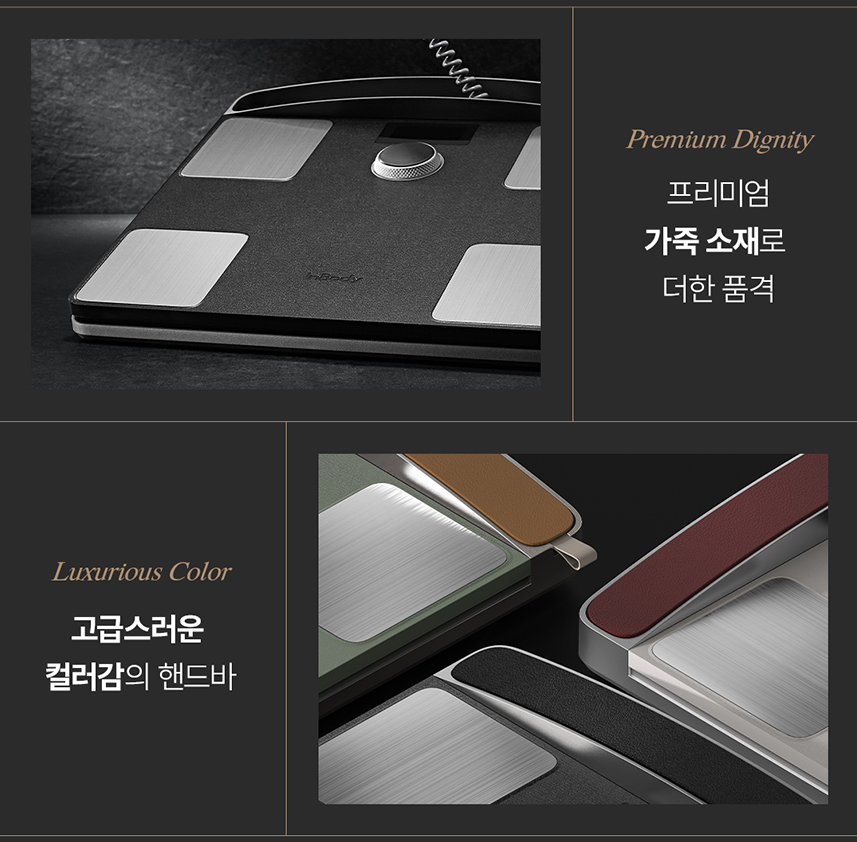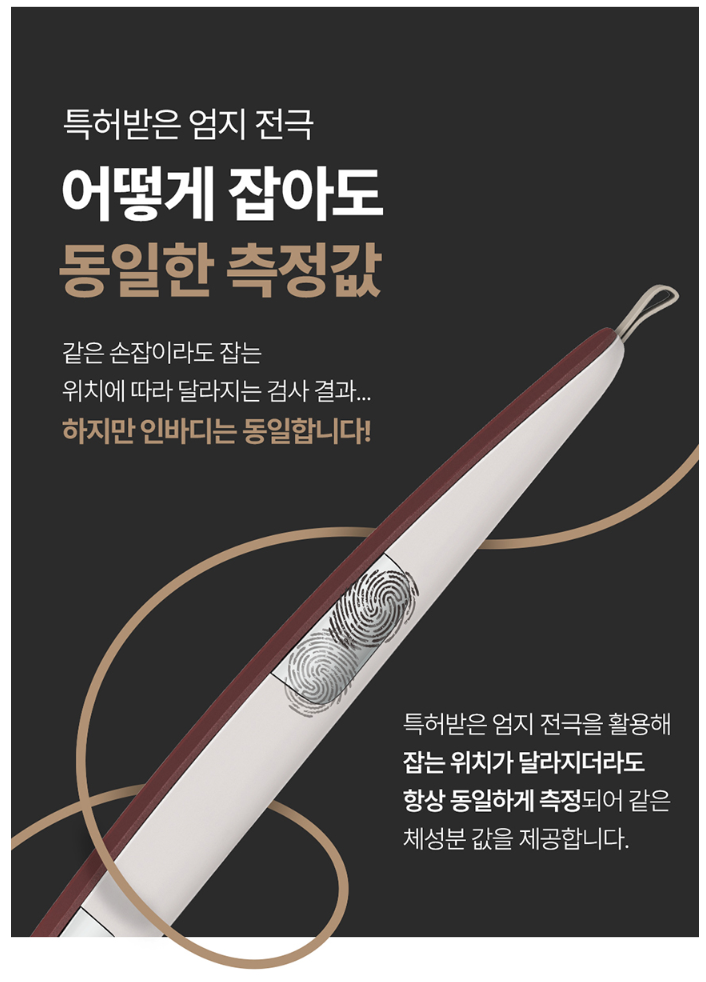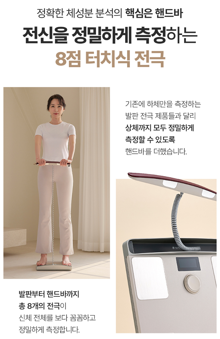 기존에 하체만을 측정하는 발판 전극 제품들과 달리 상체까지 모두 정밀하게 측정할 수 있도록 핸드바를 더했습니다.
