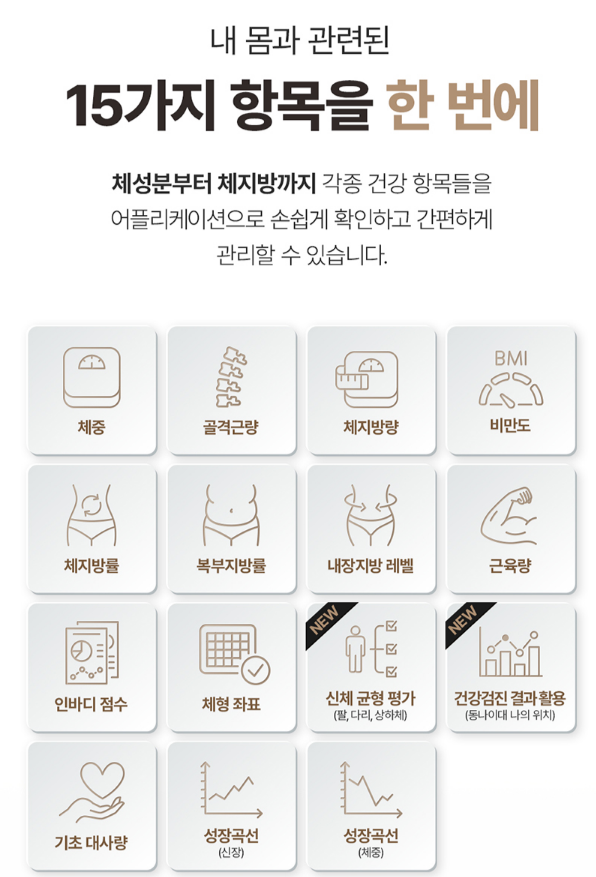 내 몸과 관련된 15가지 항목을 한 번에 체성분부터 체지방까지 각종 건강 항목들을 어플리케이션으로 손쉽게 확인하고 간편하게 관리할 수 있습니다.