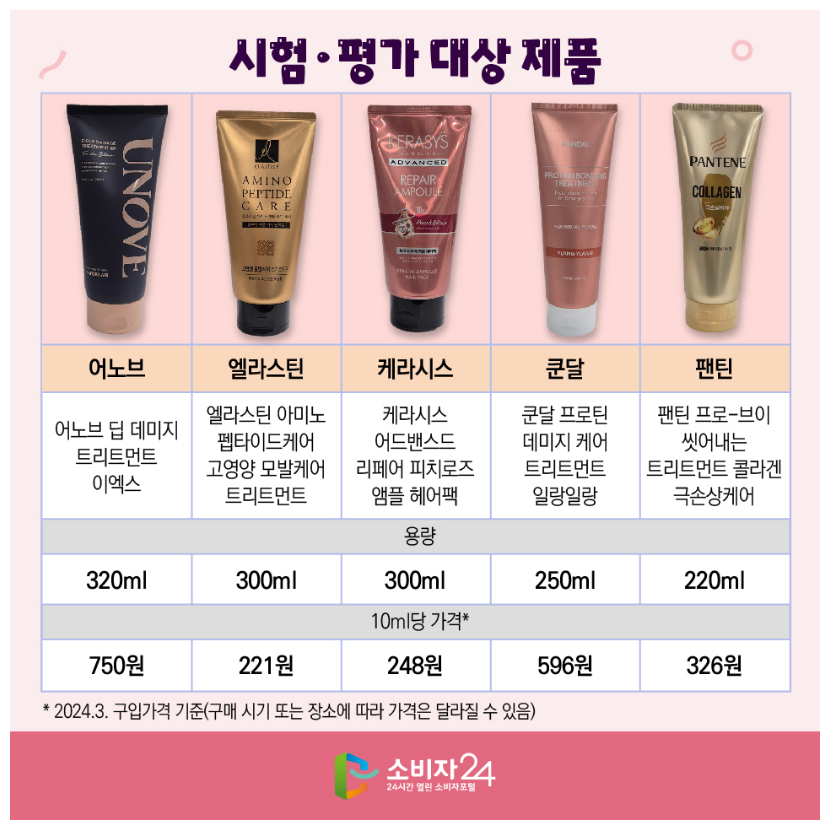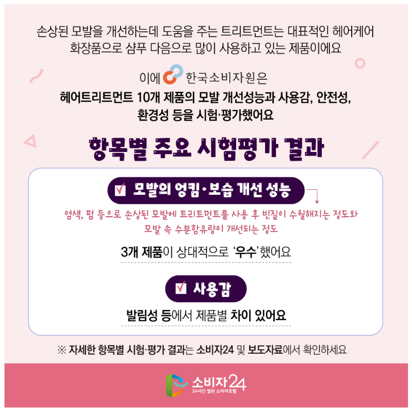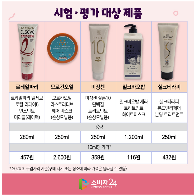 이에 한국 소비자원은 헤어트리트먼트 10개 제품의 모발 개선성능과 사용감, 안전성, 환경성 등을 시험·평가 했어요.