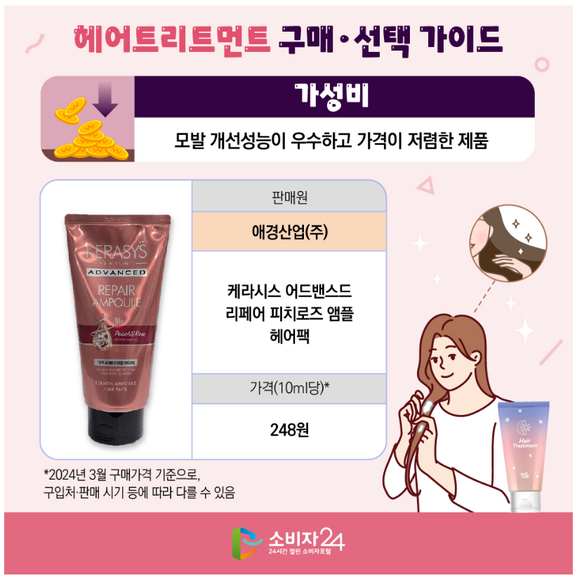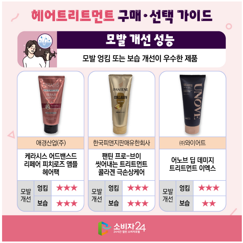 ▣ 모발 개선 성능 - 모발 엉킴 또는 보습 개선이 우수한 제품애경산업(주) 케라시스 어드밴스드 리페어 피치로즈 앰플 헤어팩 - 모발개선 : 엉킴 ★★★ / 보습 ★★★ 한국피앤지판매유한회사 팬틴 프로-브이 씻어내는 트리트먼트 콜라겐 극손상케어 - 모발개선 : 엉킴 ★★★ / 보습 ★★★ (주)와이어트 어노브 딥 데미지 트리트먼트 이엑스 - 모발개선 : 엉킴 ★★★ / 보습 ★★
