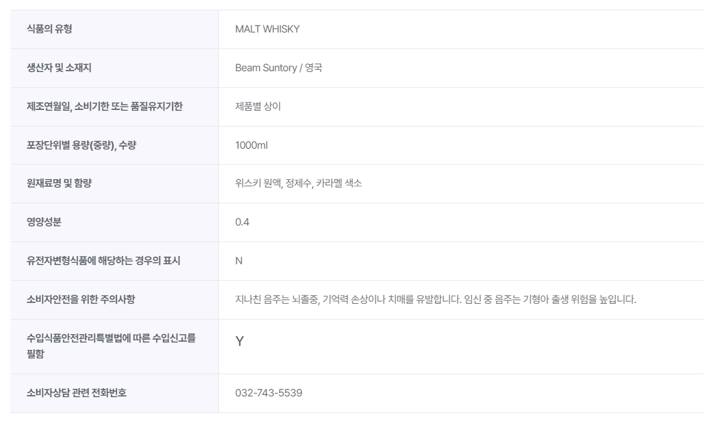 원재료명 : 위스키 원액, 정제수, 카라멜 색소