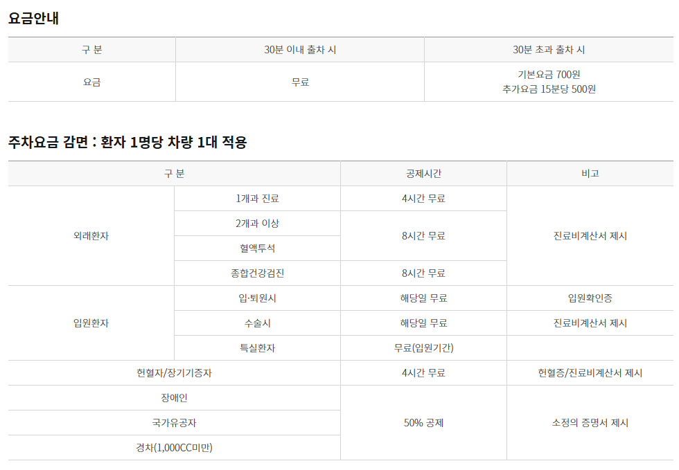 30분 이내 출차 시 무료 / 30분 초과 출차 시 기본요금 700원(추가요금 15분당 500원)
