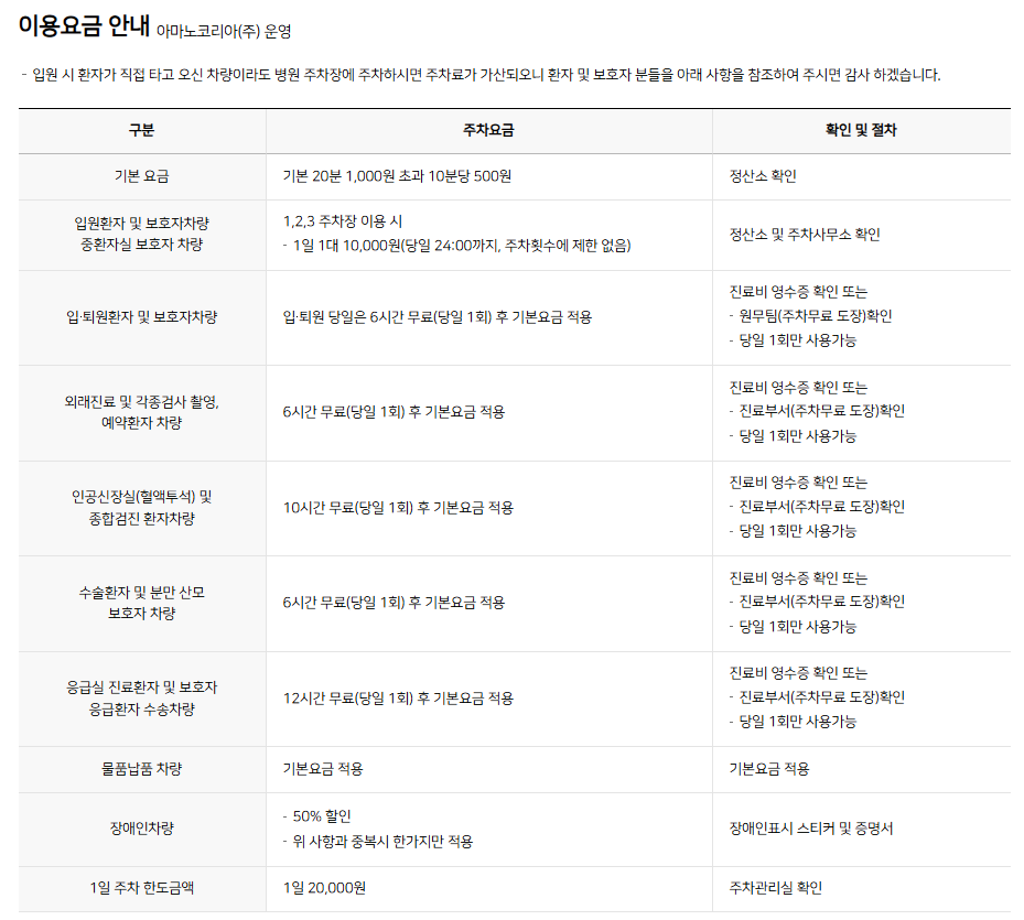 입퇴원환자 및 보호자차량 - 입퇴원 당일은 6시간 무료(당일 1회) 후 기본 요금 적용