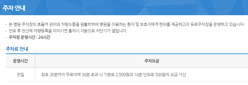 주차료 안내 : 전일 최초 30분까지 무료이며 30분 초과 시 기본료 2,000원과 10분 단위로 500원 요금 가산