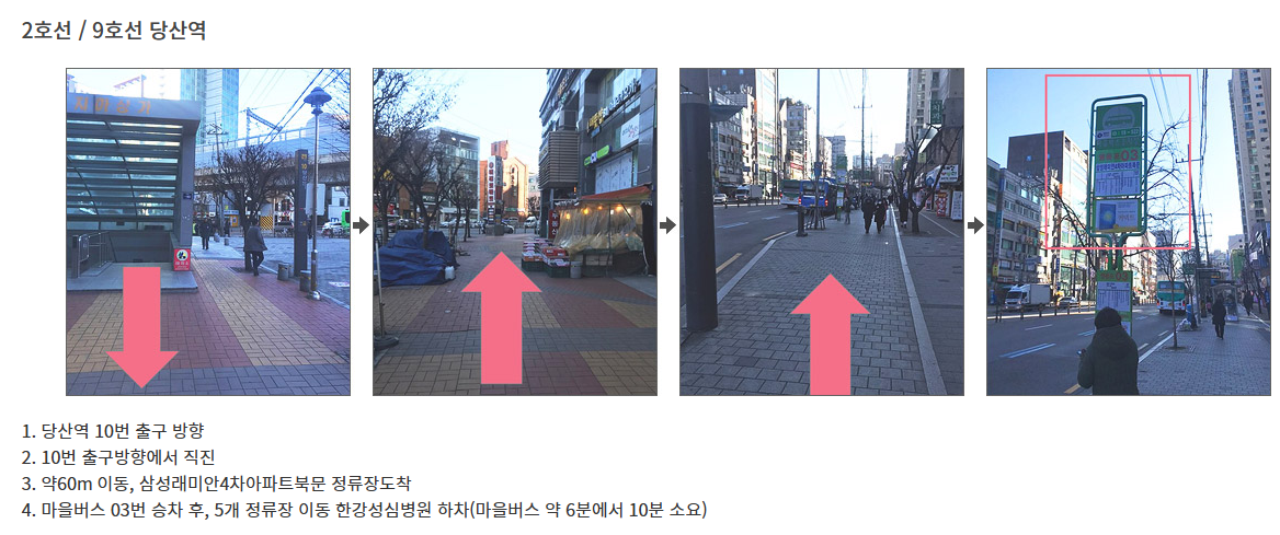 4. 03번 마을버스 승차 후 3개 정류장 이동 한강성심병원 하차(마을버스 약 5분에서 10분 소요)