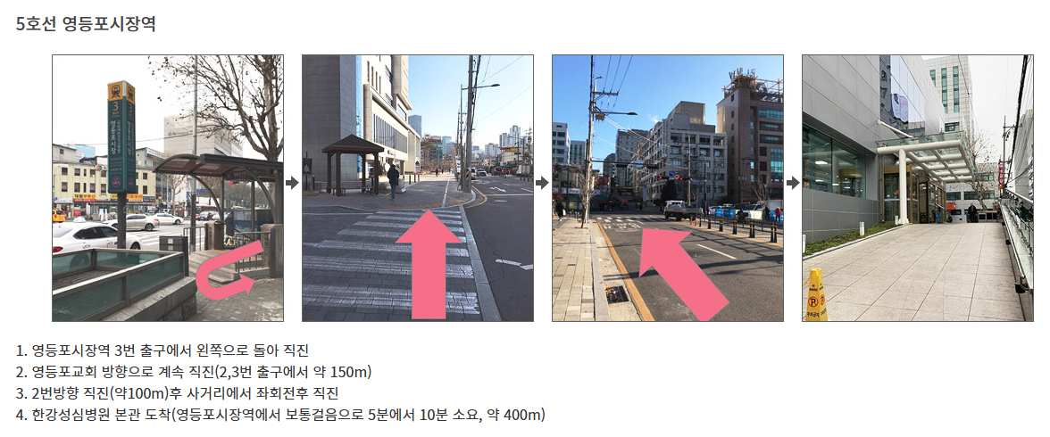 4. 한강성심병원 본관 도착(영등포시장역에서 보통걸음으로 5분에서 10분 소요, 약 400m)