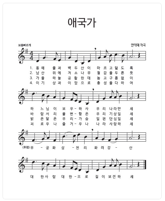 ◈ 애국가 보통빠르게, 4/4박자, 가장조(영어로 - A) 또는 사장조(영어로 - G)
