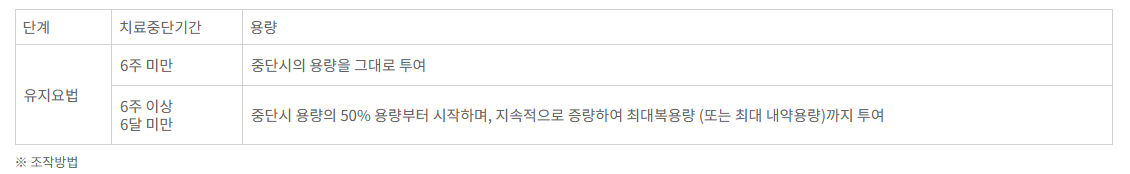 치료 중단 이후 재 치료시 개시요법과 유지요법에 대한 권장용량은 각각 다음과 같다.