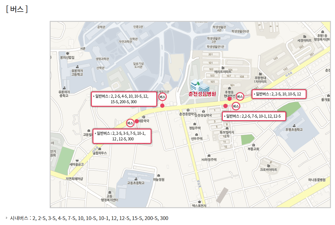 시내버스 : 2, 2-S, 3-S, 4-S, 7-S, 10, 10-S, 12, 12-S, 15-S, 200-S, 300