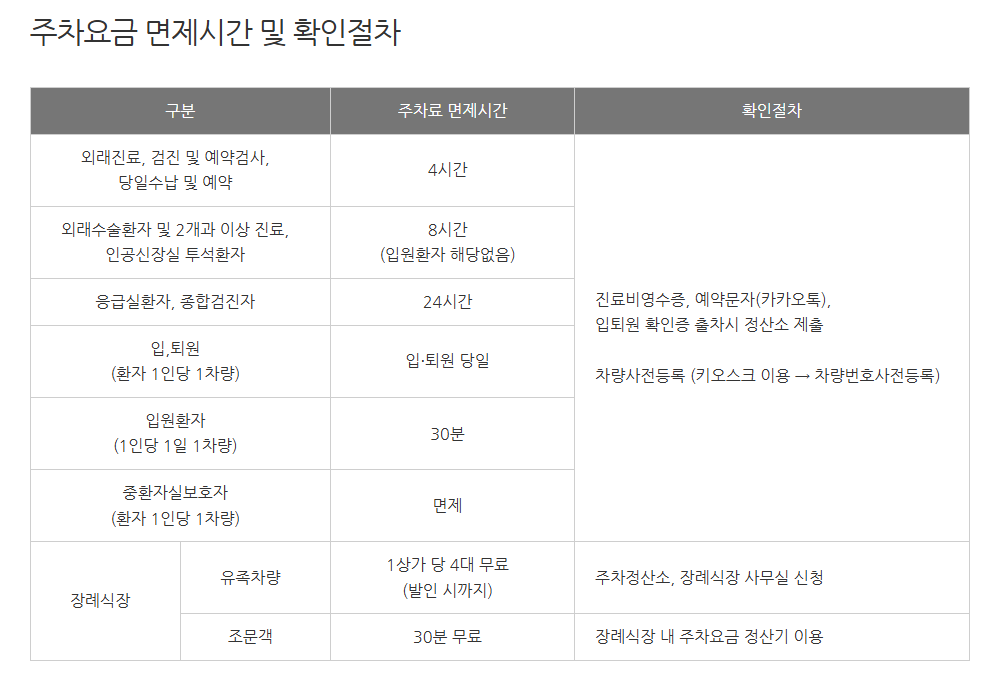 장례식장 유족차량 - 1 상가 당 4대 무료(발인 시까지) / 조문객 - 30분 무료