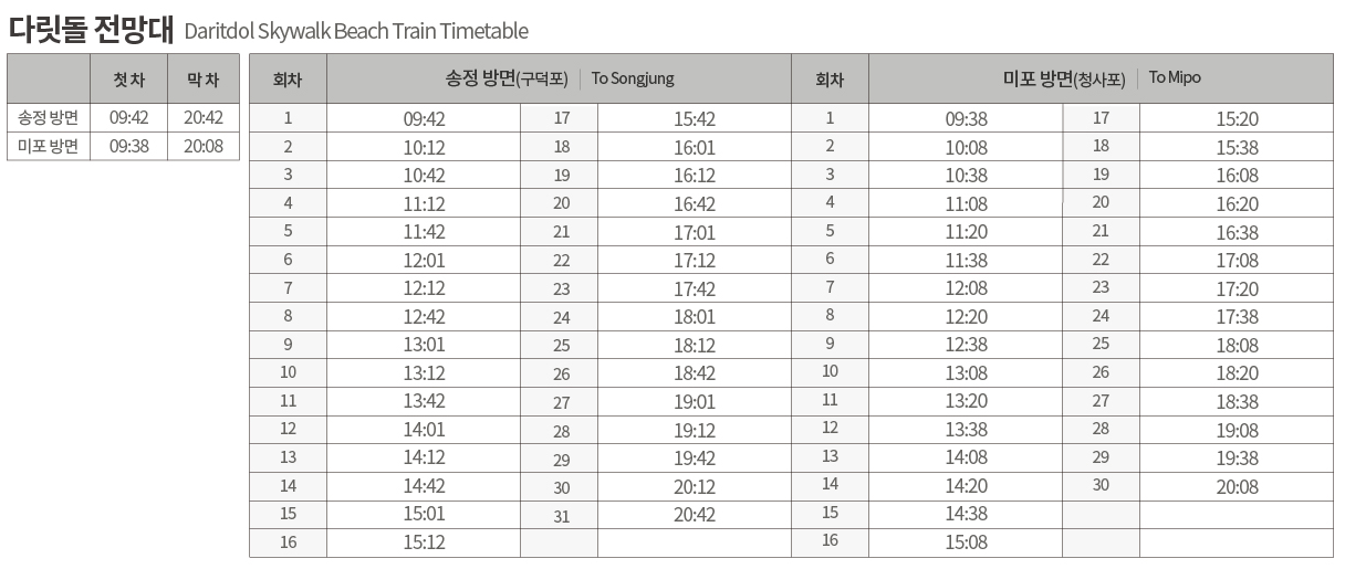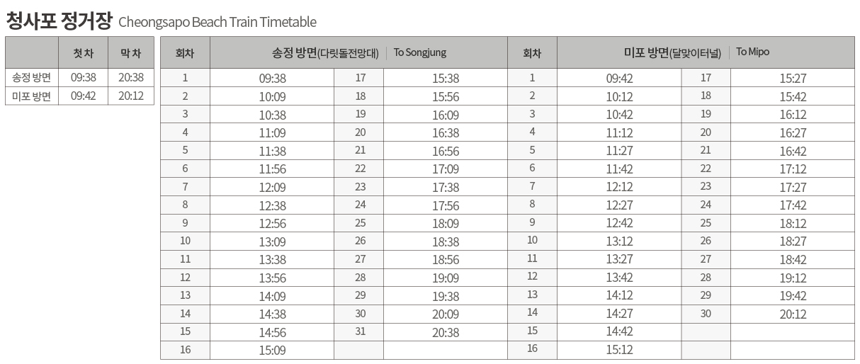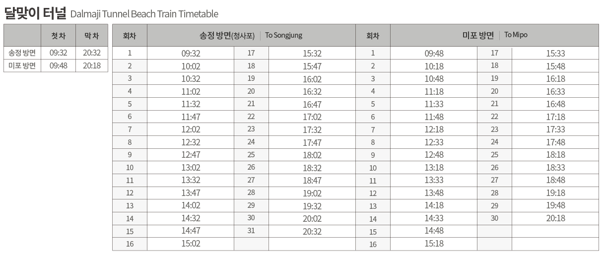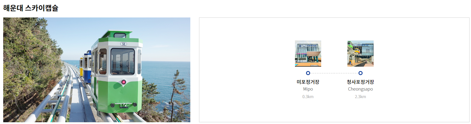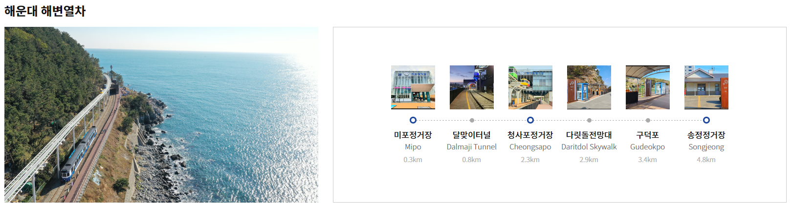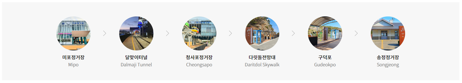 미포정거장(열차, 캡슐), 달맞이터널(열차), 청사포정거장(열차, 캡슐), 다릿돌전망대(열차), 구덕포(열차), 송정정거장(열차)