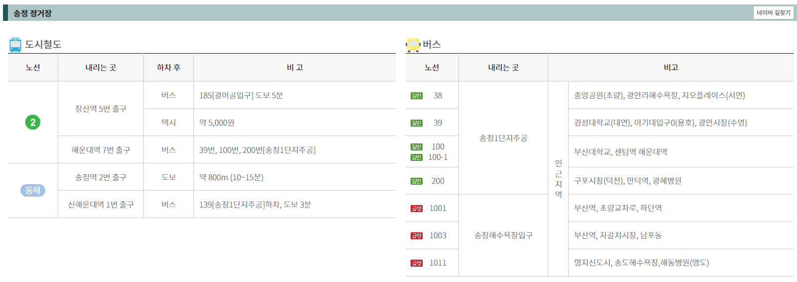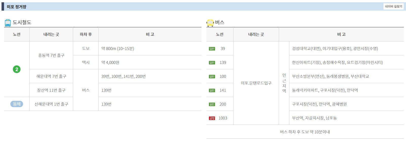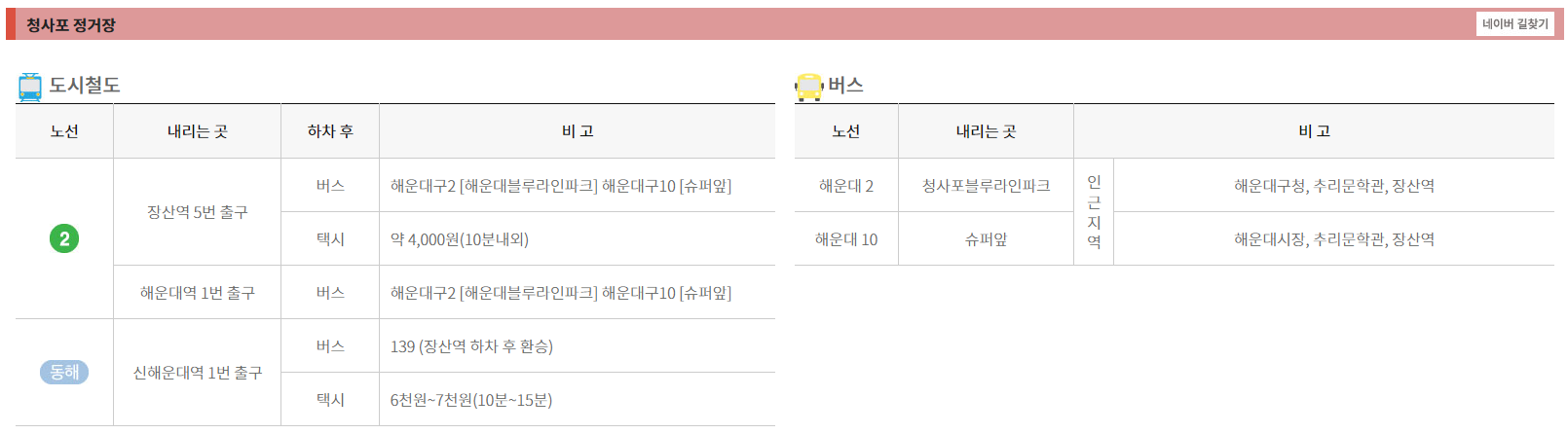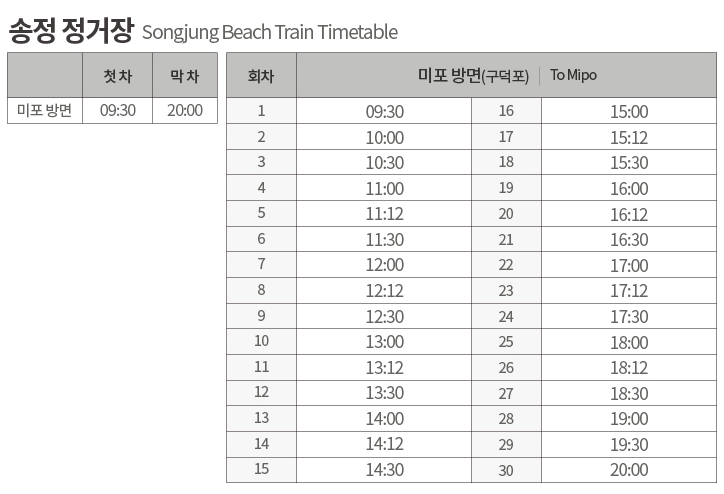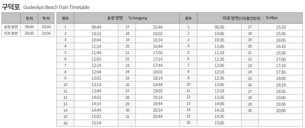 미포정거장(열차, 캡슐), 달맞이터널(열차), 청사포정거장(열차, 캡슐), 다릿돌전망대(열차), 구덕포(열차), 송정정거장(열차)