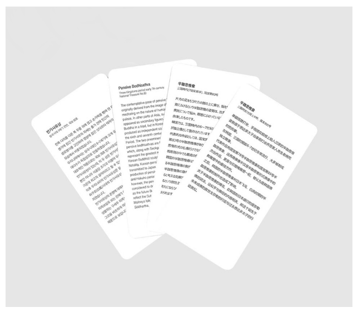 상품의 패키지 안쪽에는 반가사유상 유물의 사진을 담은 포토카드 4장이 동봉되어 있으며 포토카드의 뒷면에는 한국어, 영어, 일본어, 중국어 4개 언어로 반가사유상 유물에 대한 설명이 쓰여있다고 합니다.