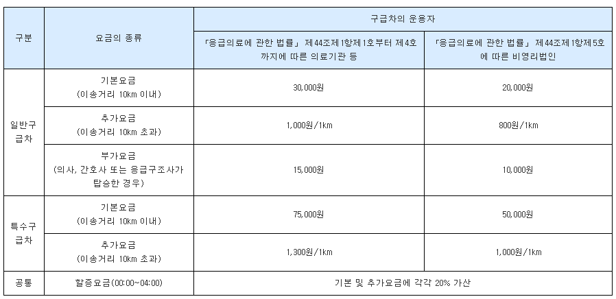 구급차를 이용할 경우 아래와 같은 이송처치료를 지불해야하며, 이송처치료 외에 의료장비 사용료, 처치비용, 소모품이나 의약품 사용료, 대기비용, 통행료, 카드 수수료, 보호자 탑승료 등 별도의 비용은 지불하지 않아도 됩니다.