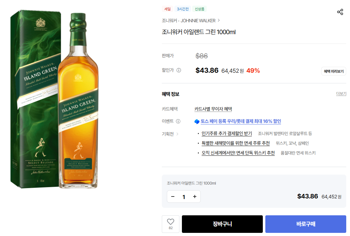스코틀랜드를 대표하는 위스키 브랜드 Johnnie Walker는 1820년대 설립 이래 글로벌 위스키 시장을 이끄는 대표 주자입니다. 다양한 라벨(레드, 블랙, 그린, 골드, 블루 등)을 통해 숙성 기간과 스타일을 세분화해 왔고, 그 중 ‘Green’ 라벨은 몰트 위스키만을 블렌딩한 블렌디드 몰트(Blended Malt) 중심의 고급형으로 받아들여져 왔습니다. 그리고 그 변형판으로서 등장한 ‘Island Green’은 특히 **섬(Island) 몰트**, 즉 아일라(Islay) 몰트를 강조한 설계로 여행자용 면세 리테일 전용 1리터(1000ml) 병이란 희소성까지 갖추어 위스키 애호가들의 주목을 받고 있습니다.