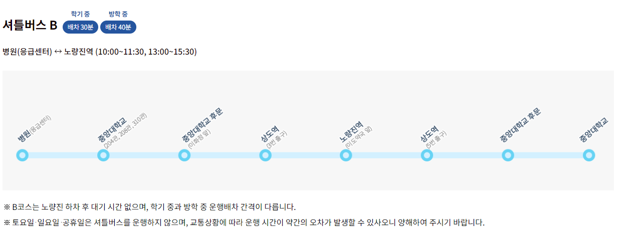 이수역 ↔ 병원(병원 후문) (08:25~11:25, 13:25~16:25), 1시간 간격 배차