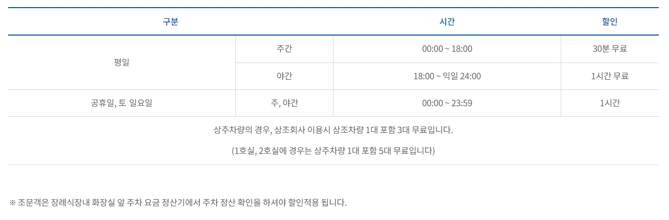 조문객은 장례식장 내 화장실 앞 주차 요금 정산기에서 주차 정산 확인을 하셔야 할인 적용됩니다.