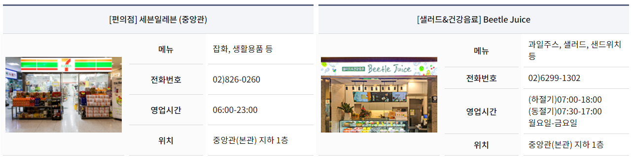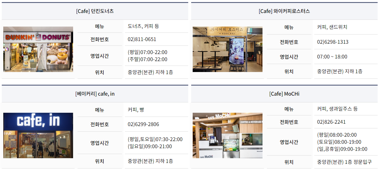 던킨도너츠, 와이커피로스터스, 카페 인(cafe, in), MoCHi, 세븐일레븐(중앙관), Beetle Juice(샐러드&건강음료)