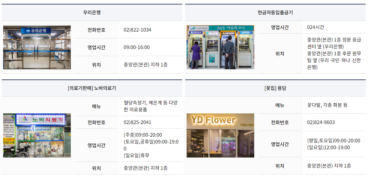 우리은행, 현금자동입출금기, 노바의료기(의료기판매), 용담(꽃집), 24시 셀프빨래방(동전교환기)
