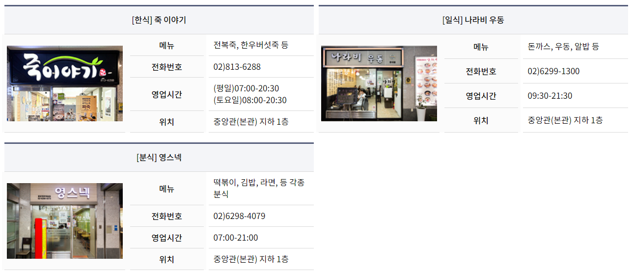 한식 : 소담, 큰솥 설렁탕, 구름산 추어탕, 한쿡, 죽 이야기