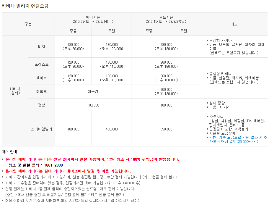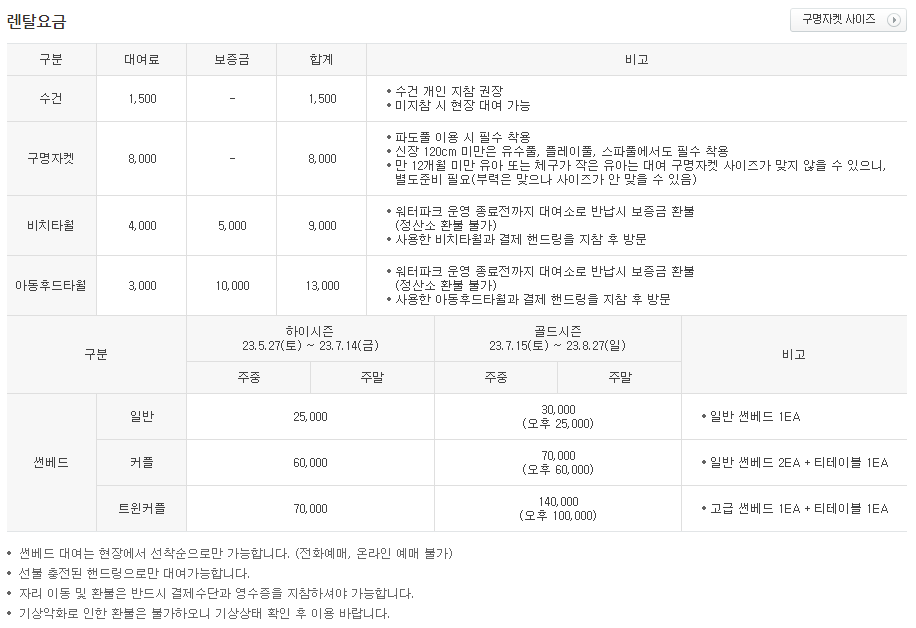 수건 1500원, 구명자켓 8,000원, 비치타월 대여료 4,000원(보증금 5,000원)-합계 9,000원, 아동후드타월 대여료 3,000원(보증금 10,000원)-합계 13,000원