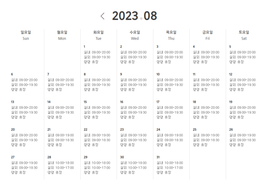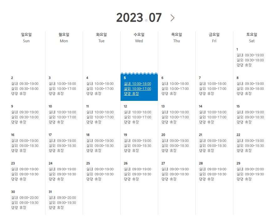 영업시간 : 월~금 10:00~17:00, 토~일 10:00~18:00, 공휴일 10:00~18:00