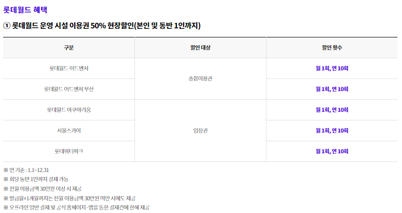 롯데월드 운영 시설 이용권 50% 현장할인(본인 및 동반 1인까지)