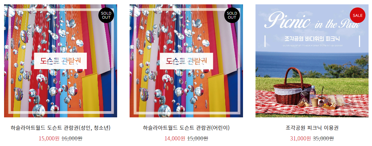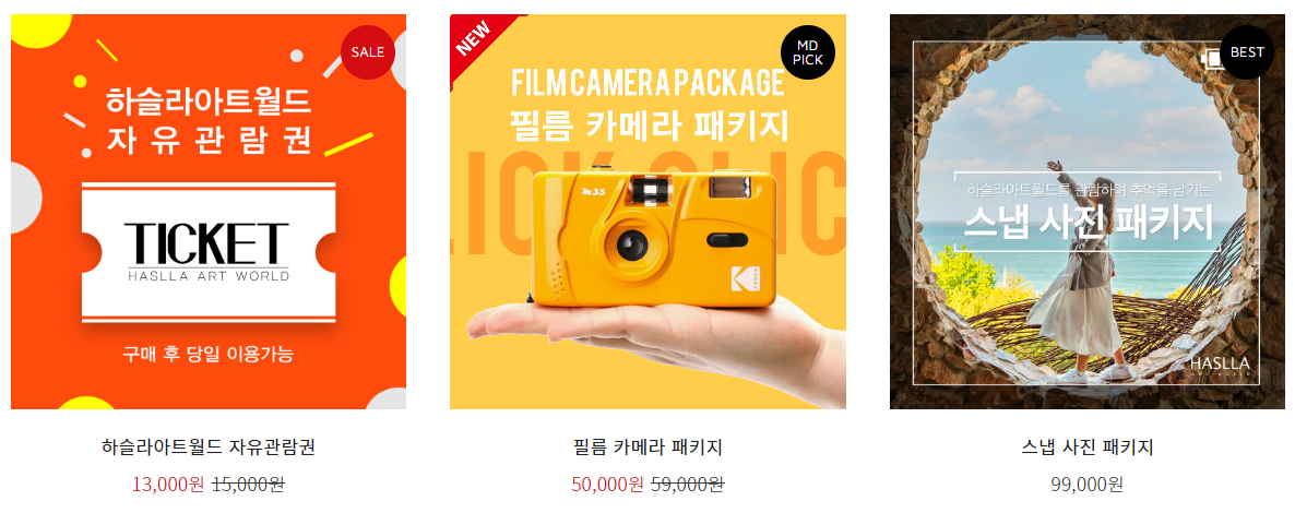 하슬라아트월드 자유관람관, 필름 카메라 패키지, 스냅사진 패키지, 조각공원 피크닉 이용권 등 홈페이지에서 할인행사도 하고 있어요. 하슬라아트월드 도슨트 관람권은 할인행사가 품절되었네요.